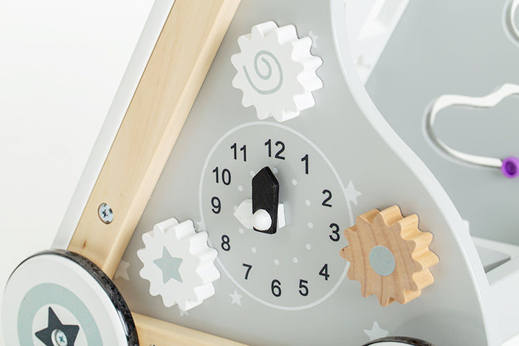 Ce joli chariot multi-activités à pousser est particulièrement adapté à l’apprentissage de la marche. Il accompagnera votre enfant en toute sécurité dès 12 mois : son frein invisible et amovible permet de bloquer les roues et de les libérer progressivement afin de maitriser la vitesse du chariot pendant l’apprentissage. En plus de la marche, votre enfant pourra tester sa motricité fine ainsi que sa dextérité avec les 9 activités ludiques proposées : boulier, boîte à formes, labyrinthe, engrenages, bouton rotatif sonore, "gratte-gratte", miroir rotatif grossissant, tambour... Très astucieux, ce chariot d’activité est équipé d’un tapis en feutrine pour atténuer le bruit et amortir la chute des cubes. Enfin, ses roues sont silencieuses ! Si on ajoute à tout ceci, son design contemporain et ses couleurs douces, on ne peut que craquer ! On aime le bois naturel, le blanc et le gris, mis en valeur par les détails colorés des nombreuses activités de ce chariot premier âge pour bébé ! Offrir un chariot de marche multi activités en bois à bébé, c’est lui proposer un jouet deux en un robuste et plein de charme. Un jouet intemporel qui pourra se transmettre de génération en génération, et qui fera craquer toute la famille ! La collection Sweet Cocoon, ce sont des jouets premier âge aux couleurs douces, aux formes arrondies, proposant des activités de découvertes amusantes pour bébé !